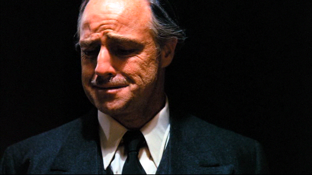 Almost as if being interrogated by the police under a harsh spotlight and placed in front of a completely black background, this shot of Vito Corleone emphasises nothing other than Brando’s heartbreaking performance: not just simply of a general who has lost his foot-soldier, but of a father who has lost his son. In this medium close-up, Coppola and cinematographer Gordon Willis detach Vito from his surroundings, as if placing him in some abstract space where there is nothing else to confront but the brutal fact that his first-born son is dead. In this moment, Vito is humanised and made sympathetic to a degree to which he has not been before. No parent should have to bury their child.