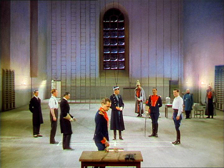 The sequence begins in the absence of Walbrook’s character who has, at this point in the film, not been present at all. Candy, meanwhile, is learning first hand about the contrived nature of the duel. He asks, ‘why wasn’t I allowed any breakfast?’ only to be countered by the reply that ‘the book says not’: an unquestioned adherence to a ‘rule’, the type of which that was once defiantly ignored by Candy and will later be ignored by the Home Guard forces who ruthlessly place tactical ingenuity before integrity and respect.
