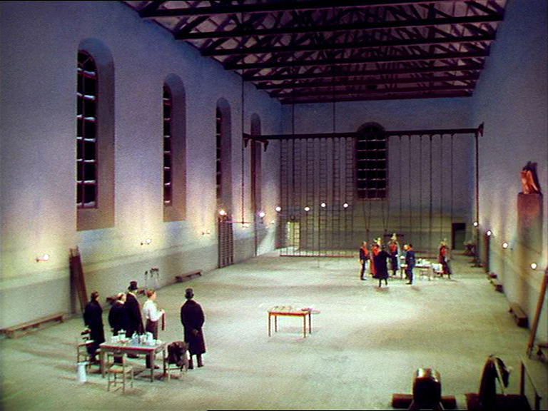 Initially, the two factions are clearly separated within the space of the hall, each looking on at each other in apprehension of what is to come. Candy comments on the choice of sabre, hoping that his is a ‘nice light one.’ His supporting officer retorts that – ‘all sabres weigh the same‘ – a remark which emphasises the significance of equality within the scene, suggesting that each combatant has a tool of equal capability, be it the ability to defend themselves, wound, or even kill their opponent. What matters isn’t the sabre itself, but the man who holds it and their approach to the task at hand. Are they able, or perhaps even capable of recognising the shared humanity present within their supposed enemy? Can they see the same fears, the same desires in the man they face?