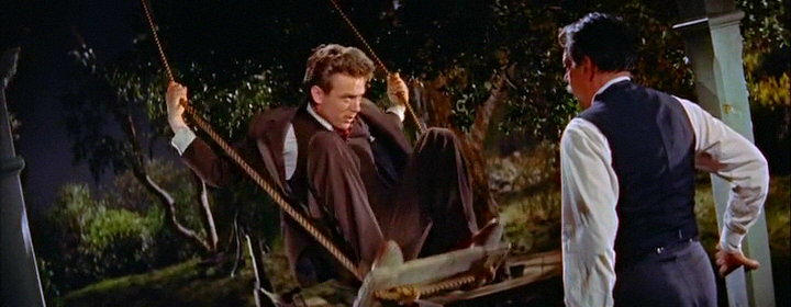Cal Trask (James Dean) squats like an ape on the childhood swing of his backyard, advancing out of the darkness towards his distressed father (Raymond Massey) as he reaches the height of the pendulum’s swing. Caught in that split-second of free fall, Cal’s life threatens to fall into an empty abyss, the brink of which his character has skirted along, not only for the duration of the film, but his entire life. He is ‘bad’ and so was his mother. Because of this, he was destined never to receive his father’s love and in this moment, as the swing rises only to fall back into darkness, Cal realises this simple truth. Caught by the framing of the shot itself, a garish canted angle, Cal finds himself in a carnivalesque funhouse of distorted familial bonds and corrupted blood ties, a subtle echo of his earlier trip to the house of mirrors with his brother’s girlfriend Abra (Julie Harris). But in this instance, the demons within aren’t the result of surreal visual trickery but the grim reality of their own family’s history. His father can only watch on in horror as the truth behind his relationship with Cal, something he probably never realised himself, is brought to the foreground. Cal’s bitter taunting as he swings in and out of the composition’s centre brilliantly captures the brash intrusion into the nuclear family unit now felt by both father and son, as each are forced to confront something that until this moment had been left unsaid.