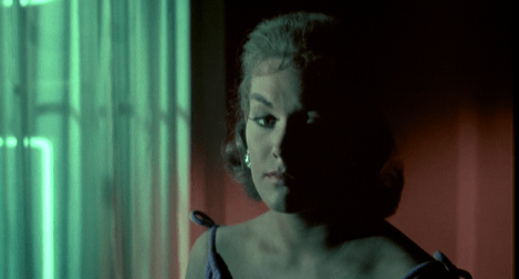 In one comparatively more subtle sequence during the latter part of the film, when Scottie first begins the process of transforming Judy (back) into his lost love Madeleine, the confrontation between the pair (set in Judy’s hotel room) is bathed in the sickly neon green light originating from the hotel sign just outside her window. It’s an intense scene. Scottie wants to see her again, having just taken her out to dinner as an apology for his first aggressive encounter. Judy (who the audience now knows to be Madeleine) fights the temptation to let the former police detective back into her life. She soon gives in to temptation.