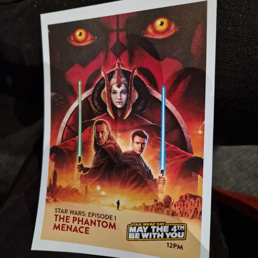 From a certain point of view, The Phantom Menace, indeed, the Star Wars franchise as a whole, takes on new and different meanings as we grow up alongside the films; we evaluate and respond to them first and foremost for their superficial qualities at a younger age: their action, their style, their central myth of good fighting against evil. In the screening I attended on May 4th, three audience members stood out to me. Whilst I can’t be certain, my assumption is that these individuals represented three generations of the same family, a young boy with his father and, perhaps, his grandfather. The child was wearing a Darth Vader mask and was clutching a toy lightsaber (no, Vader isn’t technically seen in The Phantom Menace, but we will let the kid’s error slide) whilst his youngish Dad also brandished his own weapon (‘an elegant weapon of a more civilized age’). Grandfather followed suit walking, slightly slower, but no less enthusiastically up the stairs to a row somewhere behind my own. All three of these men were there to watch The Phantom Menace, but all were undoubtedly watching three different versions of the same film. Had the grandfather taken his own son – perhaps a teenager in 1999 – to the film 25 years ago? Had he seen the original film when it came out in 1977? Was this perhaps the first time the child was watching The Phantom Menace, or perhaps any Star Wars film on the big screen? And what did the child make of it?